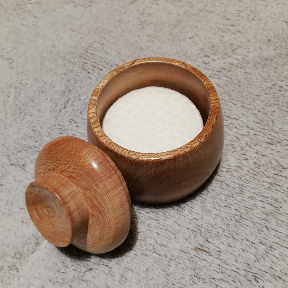 Petite boîte pour coton démaquiller. Elle est réalisé en platane et se compose de deux parties qui s'accorde.